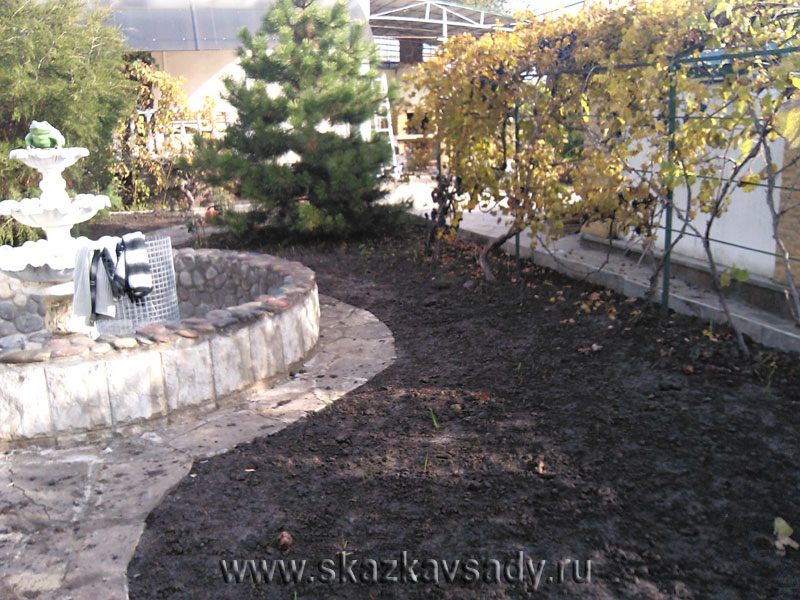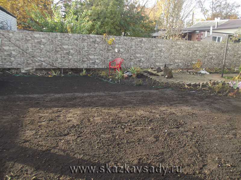 За 2 недели перед перекопкой почвы надо обработать участок Раундапом (3%раствор) от сорняков. Далее выполняют удаление корневищ, тщательную планировку при необходимости с созданием дренирующего слоя песка (на глинах). Сверху планируется плодородный грунт, часто с торфом. Планировка должна быть образцовой ещё и потому, что она делается фактически на всю жизнь газона, и исправить её потом подсыпанием грунта будет очень трудно. К тому же семена газонных трав столь мелки, что на тяжелых почвах не могут прорасти с глубины более 1 см.